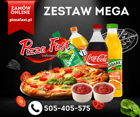 ZESTAW MEGA: Pizza 45cm + 3 ulubione dodatki, Pizza 35cm + 1 dodatek, 2 sosy (do wyboru), napój (do wyboru Coca-Cola 850ml, Fanta 850ml, Sprite 850ml, sok pomarańczowy 1L, sok jabłkowy 1L)...cena zestawu 72zł