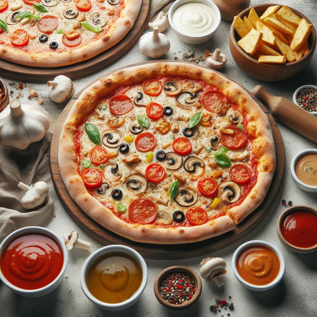 Sos ze świeżych pomidorów z bazylią, Mozzarella, Szynka, Pepperoni (kiełbasa), Grubo krojone pieczarki, Papryka, Oliwki39,00 zł57,00 zł89,00 złSosySosy